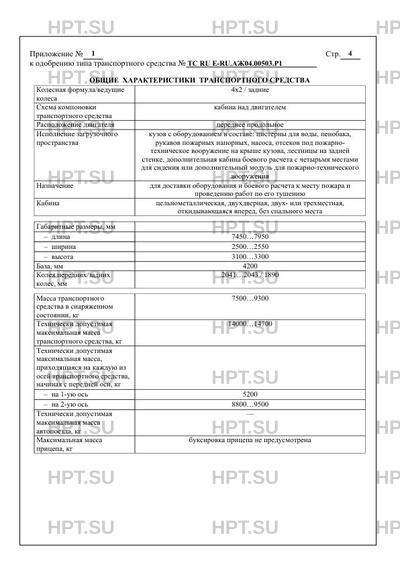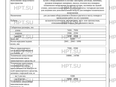 | Исполнение загрузочного пространства | кузов с оборудованием в составе: цистерны для воды, пенобака, рукавов пожарных напорных, насоса, отсеков под пожарнотехническое вооружение на крыше кузова, лестницы на задней стенке, дополнительная кабина боевого расчета с четырьмя местами для сидения или дополнительный модуль для пожарно-технического вооружения |
