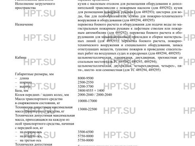 | Оборудование ТС | кузов с комплектом пожарно-технического вооружения, емкости для воды и пенообразователя (для 489294, 489295), насосная установка (для 489292, 489294, 489295), сигнальная громкоговорящая установка, проблесковые маяки синего цвета, устройство вызова экстренных оперативных служб, система спутниковой навигации ГЛОНАСС/GPS, передние и задние фары-искатели. |