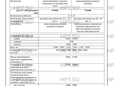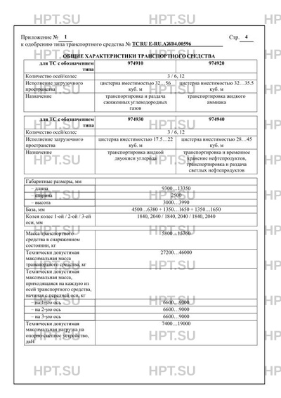 | Дополнительная информация | В случае фактического превышения значений параметров, указанных в приложении № 5 к техническому регламенту Таможенного союза «О безопасности колесных транспортных средств», для передвижения транспортных средств по территории государств-членов Евразийского экономического союза необходимо оформление специального разрешения. Транспортные средства типов 974910, 974940 относятся к транспортным средствам FL в соответствии с пунктом 9.1.1.2 Европейского соглашения о международной дорожной перевозке опасных грузов (ДОПОГ). Транспортные средства типов 974920, 974930 относятся к транспортным средствам АТ в соответствии с пунктом 9.1.1.2 Европейского соглашения о международной дорожной перевозке опасных грузов (ДОПОГ). Транспортные средства не предназначены для перевозки пищевых жидкостей. Коммерческое наименование Тип Модификации 974910 974910 (ППЦТ-32…56) полуприцеп-цистерна, полуприцеп-топливозаправщик 974940 974940 (ППЦ-28…45) 974920 974920 (ЦТА-17…20) полуприцеп-цистерна 974930 974930 (ЦЖУ-17,5…24) |