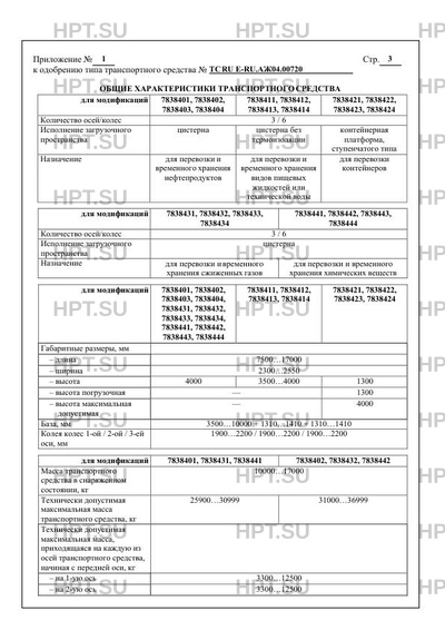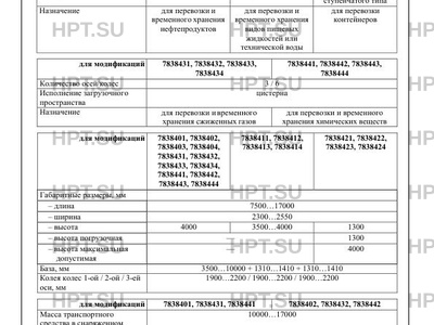| Оборудование ТС | огнетушители, огнетушители, бесшовные кабелепроводы защиты электропроводки, заземлительная цепочка и металлический штырь для защиты от статических и атмосферных электрических зарядов, ящик для песка, знак ограничения скорости, рамки под таблички по ДОПОГ; - для модификаций ТС - 7838431, 7838432, 7838433, 7838434: предохранительная цепь или трос на передней опоре по заказу: технологический бокс, пеналы для шлангов, площадка и лестница для обслуживания |