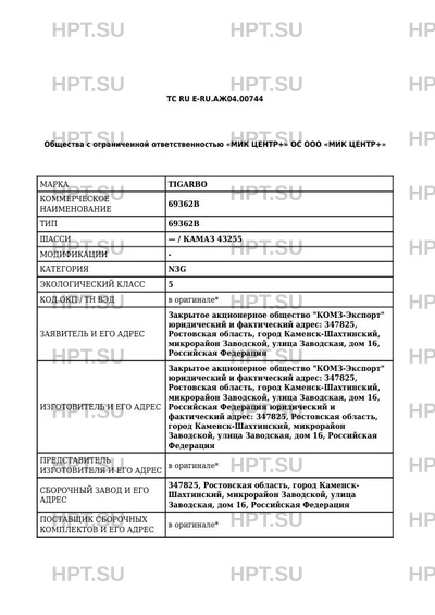 | Номер документа | ТС RU Е-RU.АЖ04.00744 |