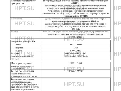 | Оборудование ТС | централизованная система регулирования давления воздуха в шинах; устройство ограничения максимальной скорости (функцию устройства ограничения максимальной скорости выполняет электронный блок управления двигателем); устройство вызова экстренных оперативных служб с автоматическим срабатыванием при опрокидывании; цистерна для воды вместимостью 4000 – 9000 л; лафетный ствол; лестницы; сигнально-громкоговорящая установка; один или три проблесковых маячка синего цвета; фары- искатели; по заказу: предпусковой подогреватель двигателя, лебедка |
