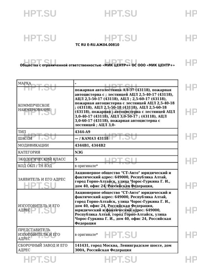Исполнение загрузочного пространства платформа с выносными опорами, с подъемно-поворотным устройством и лестницей, состоящей из телескопических соединенных секций (колен), с рабочим местом оператора и пультом управления (для 4344B1); цистерна для воды, пенобак, пожарно-техническое вооружение