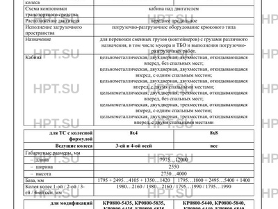 | Тип ТС | Транспортные средства изготавливаются на базе шасси модификаций: 35.320 8x4 BB, 35.320 8x4 BL, 35.320 8x8 BB, 41.320 8x4 BB, 41.320 8x4 BB-WW, 41.320 8x8 BB-WW, 41.320 8x8 BB, 35.360 8x4 BB, 35.360 8x4 BL, 35.360 8x8 BB, 35.360 8x8 BB CH, 37.360 8x4 BB, 41.360 8x4 BB, 41.360 8x4 BB-WW, 41.360 8x8 BB-WW, 41.360 8x8 BB, 41.360 8x4 BB CH, 41.360 8x8 BB CH, 35.400 8x4 BB, 35.400 8x4 BL, 35.400 8x8 BB, 35.400 8x4 BB CH, 35.400 8x8 BB CH, 37.400 8x4 BB, 41.400 8x4 BB, 41.400 8x4 BB-WW, 41.400 8x8 BB-WW, 41.400 8x8 BB, 41.400 8x4 BB CH, 41.400 8x8 BB CH, 35.420 8x4 BB, 35.420 8x4 BL, 35.420 8x8 BB, 35.420 8x4 BB CH, 35.420 8x8 BB CH, 37.420 8x4 BB, 41.420 8x4 BB, 41.420 8x4 BB-WW, 41.420 8x8 BB-WW, 41.420 8x8 BB, 41.420 8x4 BB CH, 41.420 8x8 BB CH, 35.440 8x4 BB, 35.440 8x4 BL, 35.440 8x8 BB, 35.440 8x4 BB CH, 35.440 8x8 BB CH, 37.440 8x4 BB, 41.440 8x4 BB, 41.440 8x4 BB-WW, 41.440 8x8 BB-WW, 41.440 8x8 BB, 41.440 8x4 BB CH, 41.440 8x8 BB CH, 35.460 8x4 BB, 35.460 8x4 BL, 35.460 8x8 BB, 35.460 8x4 BB CH, 35.460 8x8 BB CH, 37.460 8x4 BB, 41.460 8x4 BB, 41.460 8x4 BB-WW, 41.460 8x8 BB-WW, 41.460 8x8 BB, 41.460 8x4 BB CH, 41.460 8x8 BB CH, 35.480 8x4 BB, 35.480 8x4 BL, 35.480 8x8 BB, 35.480 8x4 BB CH, 35.480 8x8 BB CH, 37.480 8x4 BB, 41.480 8x4 BB, 41.480 8x4 BB-WW, 41.480 8x8 BB-WW, 41.480 8x8 BB, 41.480 8x4 BB CH, 41.480 8x8 BB CH, 32.500 8x4 BB CH, 35.500 8x4 BB, 35.500 8x4 BL, 35.500 8x8 BB, 35.500 8x4 BB CH, 35.500 8x8 BB CH, 37.500 8x4 BB, 41.500 8x4 BB, 41.500 8x4 BB-WW, 41.500 8x8 BB-WW, 41.500 8x8 BB, 41.500 8x4 BB CH, 41.500 8x8 BB CH, 35.540 8x4 BB, 35.540 8x4 BL, 35.540 8x8 BB, 35.540 8x4 BB CH, 35.540 8x8 BB CH, 37.540 8x4 BB, 41.540 8x4 BB, 41.540 8x4 BB-WW, 41.540 8x8 BB-WW, 41.540 8x8 BB, 41.540 8x4 BB CH, 41.540 8x8 BB CH, 37.320 8x4 BB, 35.320 8x8 BB CH, 35.320 8x4 BB CH, 41.320 8x4 BB CH, 41.320 8x8 BB CH, 35.360 8x4 BB CH В случае фактического превышения значений параметров, указанных в приложении № 5 к техническому регламенту Таможенного союза «О безопасности колесных транспортных средств» (ТР ТС 018/2011), для передвижения транспортных средств по территории государств-членов Евразийского экономического союза необходимо оформление специального разрешения. Транспортные средства, оснащенные двигателями D2066LF41, D2066LF45, D2066LF43, D2066LF47, D2066LF42, D2066LF46, D2066LF40, D2066LF44, D2676LF06, D2676LF08, D2676LF17, D2676LF07, D2676LF09, D2676LF18 относятся к экологическому классу 5. Транспортные средства, оснащенные двигателями D2676LF51, D2676LF66, D2676LF52, D2676LF67, D2676LF53, D2676LF68, D2676LF78, D2676LF84, D2676LFAB, D2676LFAE, D2676LF79, D2676LF85, D2676LF80, D2676LF86, D3876LF??, D1556LF?? относятся к экологическому классу 6 Транспортные средства не предназначены для перевозки опасных грузов. Показатели масс не могут превышать максимальных для конкретного шасси, указанных в одобрении типа шасси и в его сопроводительной документации. Для шасси типа L.2007.46.003 в заводской документации, идентификационном номере и табличке изготовителя используются внутризаводские обозначения: 37S, 39S, 41S, 49S, 59S, 90S, 92X, 92S, 93S, 94X, 95X, 96S, 73S, 86X, 87X, 39W, 49W, 60W, 37E, 37F, 39E, 39F, 41E, 41F, 49F, 59E, 90F, 91F, 92F, 93E, 96E, 98F. Модификации Экологический класс КР0800-5435, КР0800-5440, КР0800-5445, КР0800-5835, КР0800-5840, КР0800-5845 5, КР0800-6435, КР0800-6440, КР0800-6445, КР0800-6835, КР0800-6840, КР0800-6845 6. |