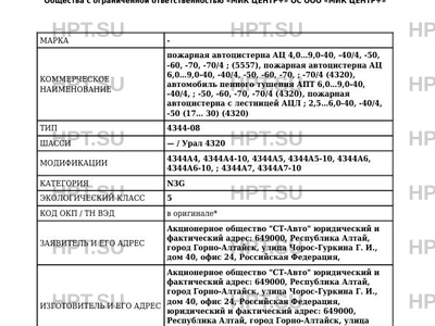 | Тип ТС | Для изготовления транспортных средств 4344А4, 4344А4-10 применяются модификации шасси 5557-78, 5557-80, 5557-82, 5557-84. Для изготовления транспортных средств 4344А5, 4344А5-10, 4344А6, 4344А6-10, 4344А7, 4344А7-10 применяются модификации шасси 4320-78, 4320-80, 4320-82, 4320-84. Базовые шасси типа 4320, выпущенные в обращение до 15.03.2021 г., имеют обозначения типа 4320, 5557 и обозначения модификаций 4320-4951-78, 4320-4971-78, 5557-4151-78, 5557-4551-78, 4320-4951-80, 4320-4971-80, 5557-4151-80, 5557-4551-80, 4320-4951-82, 4320-4971-82, 5557-4151-82, 5557-4551-82, 4320-4951-84, 4320-4971-84, 5557-4151-84, 5557-4551-84. Коммерческое наименование Модификации автомобиль пенного тушения АПТ 6,0…9,0-40, - 40/4, -50, -60, -70, -70/4 (4320) 4344А6, 4344А6-10 пожарная автоцистерна АЦ 4,0…9,0-40, -40/4, - 50, -60, -70, -70/4 (5557) 4344А4, 4344А4-10 пожарная автоцистерна АЦ 6,0…9,0-40, -40/4, - 50, -60, -70, -70/4 (4320) 4344А5, 4344А5-10 пожарная автоцистерна с лестницей АЦЛ 2,5… 6,0-40, -40/4, -50 (17… 30) (4320) 4344А7, 4344А7-10 |