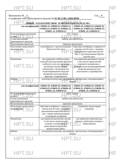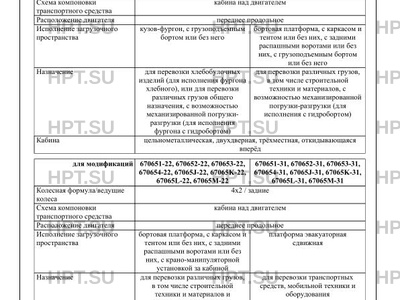 | Оборудование ТС | оборудование базового шасси: электронная система контроля устойчивости (только для модификаций 670651-??, 670652-??, 670653-??, 670654-??, 67065J-??, 67065K-??, 67065L-??, 67065M-??); устройство вызова экстренных оперативных служб; переднее защитное устройство (только для модификаций 670651-??, 670652 -??, 670653-??, 670654-??, 67065J-??, 67065K-??, 67065L-??, 67065M -??) коробка отбора мощности, клапан электромагнитный; один или два проблесковых маячка оранжевого цвета (для ТС 67065?-3?) по заказу: система автоматического управления технологическим оборудованием; система видеонаблюдения; система дезинфекции; лестница; фара освещения рабочей зоны; один или два проблесковых маячка оранжевого цвета, система увеличения оборотов холостого хода (для ТС 67065?-61); сцепное устройство (для модификаций 67065?-11, 67065?-21, 67065?-22, 67065?-41, 67065?-42, 67065?-43, 67065?-44, 67065?-51, 67065?-52, 67065?-61 (вариант исполнения с боковым загрузочным устройством)); оборудование базового шасси по заказу: подушка безопасности водителя; ремень безопасности с преднатяжителем, для водителя; подушка безопасности пассажира; ремень безопасности с преднатяжителем, для бокового пассажира; кондиционер; электростеклоподъемники; наружные зеркала заднего вида с обогревом; наружные зеркала заднего вида с электроприводом; наружные зеркала заднего вида с обогревом и электроприводом; центральный замок; иммобилайзер; заднее стекло в кабине; внутреннее зеркало заднего вида; предпусковой подогревательотопитель (для модификаций 670651-??, 670652-??, 670653-??, 670654-??, 670655-??, 670656-??); дополнительный отопитель (для модификаций 670651-??, 670652-??, 670653-??, 670654-??, 670655-??, 670656-??); тахограф; устройство ограничения максимальной скорости (функцию устройства ограничения максимальной скорости выполняет блок управления двигателем); телематическое устройство |