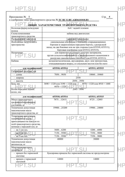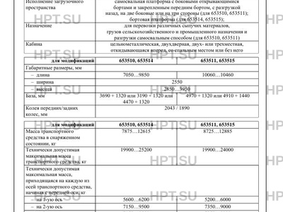 | Исполнение загрузочного пространства | самосвальная платформа с боковыми открывающимися бортами и закрепленным передним бортом, с разгрузкой назад, на две боковые или на три стороны (для 653510, 653511); бортовая платформа (для 653514, 653515) |