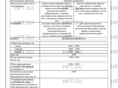 | Исполнение загрузочного пространства | фургон промтоварный; фургон универсальный; фургон хлебный; фургон изотермический; автомагазин; фургон рефрижератор; с задними двустворчатыми дверями или без них; с боковыми дверями или без них фургон-лаборатория; фургонмастерская; с задними двустворчатыми дверями или без них; с боковыми дверями или без них; с окнами или без них |