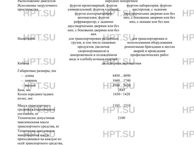 | Назначение | длятранспортировкиразличных грузов,втомчислепищевых продуктов,(включая скоропортящиеся)в замороженномиохлаждённом видеихлебобулочныхизделий длятранспортировкии использованияоборудования ремонтнымибригадамивместах аварийипроведения профилактическихработ |
