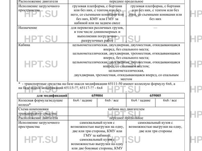 | Оборудование ТС | устройство ограничения максимальной скорости (функцию устройства ограничения максимальной скорости выполняет электронный блок управления двигателем); устройство вызова экстренных оперативных служб с функцией автоматического срабатывания при опрокидывании по заказу: предпусковой подогреватель; кондиционер (хладагент 134a); передние противотуманные фары (для ТС изготовленных на базе шасси, имеющих официальное утверждение на основании Правил ООН № 48-05); устройства освещения рабочей зоны; устройства увязки; тент (для модификаций 659004, 659005); рация; инструментальный ящик; лебедка |