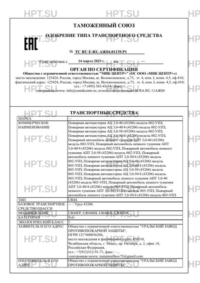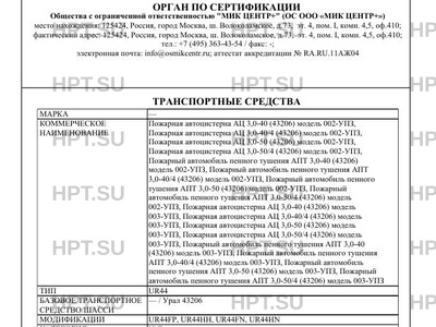 | Коммерческое наименование | Пожарная автоцистерна АЦ 3,0-40 (43206) модель 002-УПЗ, ; Пожарная автоцистерна АЦ 3,0-40/4 (43206) модель 002-УПЗ, ; Пожарная автоцистерна АЦ 3,0-50 (43206) модель 002-УПЗ, ; Пожарная автоцистерна АЦ 3,0-50/4 (43206) модель 002-УПЗ, ; Пожарный автомобиль пенного тушения АПТ 3,0-40 (43206) ; модель 002-УПЗ, Пожарный автомобиль пенного тушения АПТ ; 3,0-40/4 (43206) модель 002-УПЗ, Пожарный автомобиль пенного ; тушения АПТ 3,0-50 (43206) модель 002-УПЗ, Пожарный ; автомобиль пенного тушения АПТ 3,0-50/4 (43206) модель ; 002-УПЗ, Пожарная автоцистерна АЦ 3,0-40 (43206) модель ; 003-УПЗ, Пожарная автоцистерна АЦ 3,0-40/4 (43206) модель ; 003-УПЗ, Пожарная автоцистерна АЦ 3,0-50 (43206) модель ; 003-УПЗ, Пожарная автоцистерна АЦ 3,0-50/4 (43206) модель ; 003-УПЗ, Пожарный автомобиль пенного тушения АПТ 3,0-40 ; (43206) модель 003-УПЗ, Пожарный автомобиль пенного тушения ; АПТ 3,0-40/4 (43206) модель 003-УПЗ, Пожарный автомобиль ; пенного тушения АПТ 3,0-50 (43206) модель 003-УПЗ, Пожарный ; автомобиль пенного тушения АПТ 3,0-50/4 (43206) модель 003-УПЗ |
