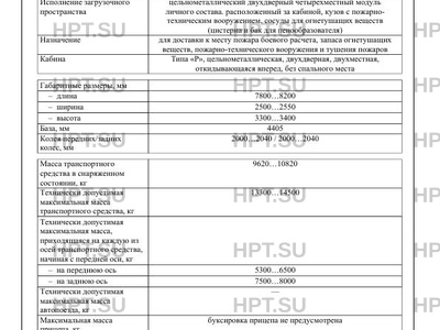 | Исполнение загрузочного пространства | цельнометаллический двухдверный четырехместный модуль личного состава. расположенный за кабиной, кузов с пожарнотехническим вооружением, сосуды для огнетушащих веществ (цистерна и бак для пенообразователя) |