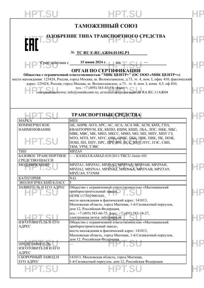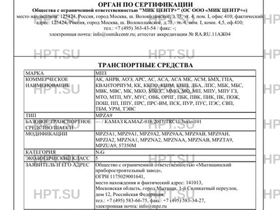 | Оборудование ТС | устройство ограничения максимальной скорости (функцию устройства ограничения максимальной скорости выполняет электронный блок управления двигателем); дневные ходовые огни; устройство вызова экстренных оперативных служб с функцией автоматического срабатывания при опрокидывании; технологическое оборудование, устройства и элементы конструкции для обеспечения возможности перевозки опасных грузов, аппаратура спутниковой навигации, два проблесковых маячка автожелтого цвета (для 57350M, MPZ5A1); аутригеры (для MPZJA2); сигнальногромкоговорящая установка, один, два или три проблесковых маячка синего цвета, фары-искатели (для MPZ9A1, MPZ9AA, MPZ9AB, MPZ9A2, MPZ9AH, MPZTA9, MPZUA9 с коммерческим наименованием ПУР, ПУС, МУС, АСМ, АСА, АСА МК, ПП, ППУ, МП, МПУ, МПУ ГЗ, ПЭС, МБС, МО, МУ; MPZNA1, MPZNA2, MPZNAA, MPZNAB с коммерческим наименованием ПП, ППУ, МП, МПУ, МПУ ГЗ, ПОШ, ПЭС) по заказу: кондиционер; отопительно-вентиляционная установка; грузоподъемный борт; замки крепления контейнера; фары-искатели; лестница; отопители; ограждение крыши; мачта с устройствами и системой управления; предпусковой подогреватель двигателя; лебедка; коробка отбора мощности; передние противотуманные фары (кроме транспортных средств на шасси, имеющих официальное утверждение на основании Правил ООН № 48-04), коробка отбора мощности с оборудованием для гидропривода, аутригеры (для MPZ9A1, MPZ9A2, MPZ9AА, MPZ9AВ, MPZ9AН, MPZNA1, MPZNA2, MPZNAA, MPZNAB, MPZТА9, MPZUА9) |