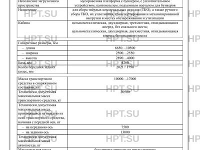 | Тип ТС | Транспортные средства изготавливаются на базе шасси модификаций: 53605-A5, 53605-5H Показатели масс не могут превышать максимальных для конкретного шасси, указанных в одобрении типа шасси, на табличке изготовителя шасси и в его сопроводительной документации. В случае фактического превышения транспортным средством ограничений, установленных приложением № 5 к ТР ТС 018/2011, для его передвижения по территории Евразийского экономического союза необходимо оформление специального разрешения. Наименование транспортного средства, определяемое его назначением: автомобиль-мусоровоз. Допускается использование в качестве базовых шасси, выпущенных по предыдущим версиям одобрения типа шасси, с общими техническими характеристиками, соответствующими указанным в приложении № 1 к настоящему ОДОБРЕНИЮ ТИПА ТРАНСПОРТНОГО СРЕДСТВА, с применявшимися ранее обозначениями: типа 53605 модификаций 53605-А5, 53605-5Н. Перевод буквенно-цифрового обозначения модификации базового шасси в в вариант для формализованного (цифрового) кода продукции в процессе производства и отгрузки в соответствии с системой SAP (System Analysis and Program Development), применяемой изготовителем шасси: 53605-A5 - 53605-48; 53605-5H - 53605-56 |