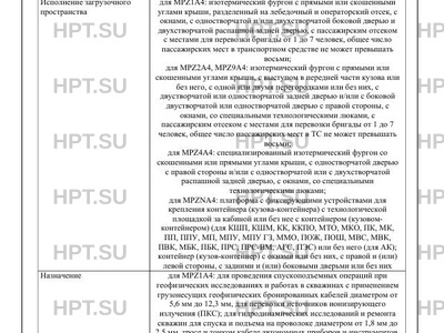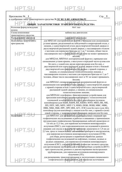 | Исполнение загрузочного пространства | для MPZ1A4: изотермический фургон с прямыми или скошенными углами крыши, разделенный на лебедочный и операторский отсек, с окнами, с одностворчатой и/или двухстворчатой боковой дверью и двухстворчатой распашной задней дверью, с пассажирским отсеком с местами для перевозки бригады от 1 до 7 человек, общее число пассажирских мест в транспортном средстве не может превышать восьми; для MPZ2A4, MPZ9A4: изотермический фургон с прямыми или скошенными углами крыши, с выступом в передней части кузова или без него, с одной или двумя перегородками или без них, с двустворчатой или одностворчатой задней дверью и/или с боковой двустворчатой или одностворчатой дверью с правой стороны, с окнами, со специальными технологическими люками, с пассажирским отсеком с местами для перевозки бригады от 1 до 7 человек, общее число пассажирских мест в ТС не может превышать восьми; для MPZ4A4: специализированный изотермический фургон со скошенными или прямыми углами крыши, с одностворчатой дверью с правой стороны и/или с одностворчатой или с двухстворчатой распашной задней дверью, с окнами, со специальными технологическими люками; для MPZNA4: платформа с фиксирующими устройствами для крепления контейнера (кузова-контейнера) с технологической площадкой за кабиной или без нее с контейнером (кузовомконтейнером) (для КШП, КШМ, КК, ККПО, МТО, МКО, ПК, МК, ПП, ППУ, МП, МПУ, МПУ ГЗ, ММО, ПОЖ, ПОШ, МВС, МВК, ПВК, МБК, ПБК, ПРС, ПРС-ВМ, АГС, ПЭС) или без него (для АК); контейнер (кузов-контейнер) с окнами или без них, с правой и (или) левой стороны, с задними и (или) боковыми дверьми или без них |