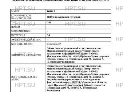 | Заявитель | Общество с ограниченной ответственностью Машиностроительный завод "Тонар" место нахождения и фактический адрес: 142635, Московская область, город Орехово-Зуево, деревня Губино, улица 1-я Ленинская, дом 76, корпус А, Российская Федерация |