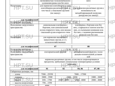| Исполнение загрузочного пространства | грузовая платформа, прямой или ломаной конструкции, с замками для крепления контейнеров, с возможностью телескопического удлинения рамы или без него закрытый фургон с задними распашными дверьми, с гидравлическим бортом или без него самосвальная платформа с бортами, или самосвальный кузов открытого типа, или несамо -свальный кузов открытого типа платформа с бортами или без них, с каркасом и тентом или без них, со съемными кониками или без них, с задними распашными дверьми или без них изотермический фургон изотермический фургон с холодильно-отопительной установкой |