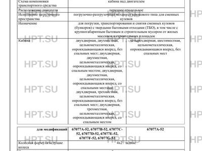 Оборудование ТС устройство вызова экстренных оперативных служб с автоматическим срабатыванием при опрокидывании; устройство ограничения максимальной скорости (ограничение максимальной скорости осуществляется электронной системой управления двигателем); коробка отбора мощности; клапан электромагнитный; аппаратура спутниковой навигации по заказу: система автоматического управления технологическим оборудованием; система видеонаблюдения; лестница; фара освещения рабочей зоны; автономный отопитель кабины; предпусковой подогреватель двигателя; кондиционер (хладагент R134А); электроблокировка замков дверей; антенна; тахограф; лебедка (для модификаций 67077A-51, 67077A-52, 67077A-53 67077B-51, 67077B-52, 67077B-53, 67077C-51, 67077C-52, 67077C- 53, 67077D-51, 67077D-52, 67077D-53 67077E-51, 67077E-52, 67077E -53)