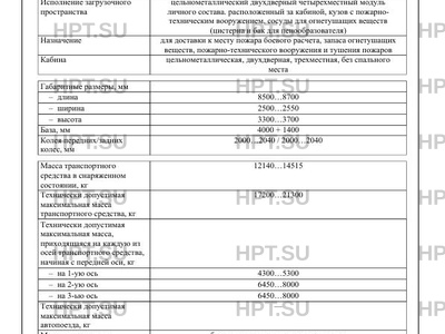 | Исполнение загрузочного пространства | цельнометаллический двухдверный четырехместный модуль личного состава. расположенный за кабиной, кузов с пожарнотехническим вооружением, сосуды для огнетушащих веществ (цистерна и бак для пенообразователя) |