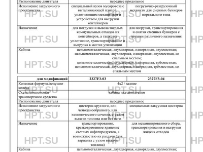 | Исполнение загрузочного пространства | специальный кузов мусоровоза с выталкивающей плитой, уплотняющим механизмом и устройством для выгрузки контейнеров погрузочно-разгрузочный механизм для сменных бункеров портального типа цистерна круглого, или чемоданообразного, или эллиптического сечения, с узлом выдачи топлива или без него специальная вакуумная цистерна погрузочно-разгрузочное оборудование крюкового типа цистерна с оборудованием для перевозки и распределения жидких битумных материалов, с емкостью для воды или без неё фургон с задними распашными воротами фургон с задними распашными воротами, с грузоподъемным бортом фургон изотермический с задними распашными воротами, с боковой дверью или без неё фургон изотермический с задними распашными воротами, с боковой дверью или без неё, с грузоподъемным бортом фургон изотермический с холодильно-отопительной установкой с задними распашными воротами, с боковой дверью или без неё фургон изотермический с холодильно-отопительной установкой с задними распашными воротами, с боковой дверью или без неё, с грузоподъемным бортом грузовая платформа с высокими или низкими бортами, с возможностью выгрузки на одну, две или три стороны подъемное оборудование с рабочей платформой специальная сдвижная или стационарная платформа, с краноманипуляторной установкой или без неё специальный отапливаемый фургон, с боковой дверью, с окнами или без них, оборудованный пассажирскими сиденьями (до 4 мест), с платформой с бортами; специальный отапливаемый фургон, поделенный на два отсека, с боковой дверью, с окнами или без них, оборудованный пассажирскими сиденьями (до 4 мест), с задними распашными дверьми бортовая платформа, с каркасом и тентом или без них, с задними распашными воротами или без них |