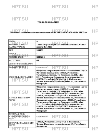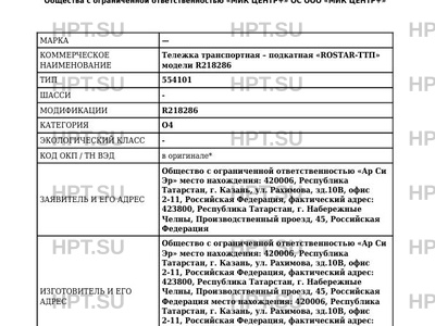 | Коммерческое наименование | Тележка транспортная - подкатная "ROSTAR-ТТП" модели R218286 |