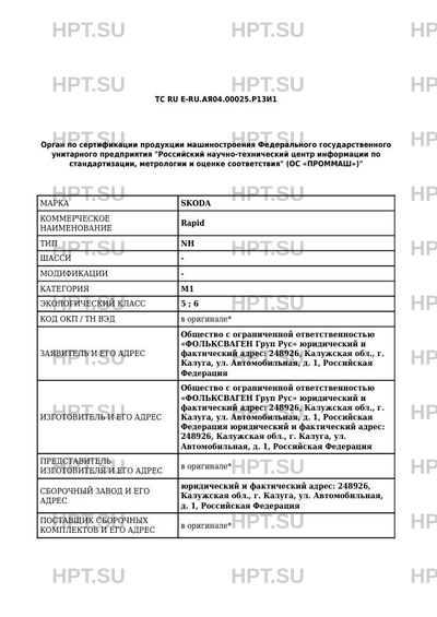 | Заявитель | Общество с ограниченной ответственностью «ФОЛЬКСВАГЕН Груп Рус» юридический и фактический адрес: 248926, Калужская обл., г. Калуга, ул. Автомобильная, д. 1, Российская Федерация |
