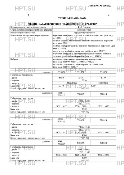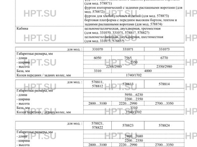 | Исполнение загрузочного пространства | бортовая платформа с дугами и тентом или без них (для мод. 3310??) фургон общего назначения с задними распашными воротами (для мод. 5788?1) фургон изотермический с задними распашными воротами (для мод. 5788?2) фургон для хлебобулочных изделий (для мод. 5788?3) бортовая платформа с передним высоким бортом, тентом и задними распашными воротами (для мод. 5788?4) |