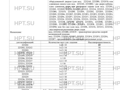 | Оборудование ТС | система обеспечения курсовой устойчивости (ESP), подушка безопасности водителя, иммобилайзер, люк, дополнительный отопитель для мод. 223201, 223202, 223203, 223204, 223205, 223206, , 223212, 223214, 223215, 223216, 223210, 223211, 223217, 223218, 223220, 223221, 223222, 223223, 223224, 223225, 223226, 223233, 223236, 223227, 223237, 223228, 223229, 223238, 223239: багажные полки, багажные сетки, мини - бар, холодильник, аудиовидеотехника, микроволновая печь, кондиционер с хладагентом R134A, подножки, тахограф, камера заднего вида, навигационная система, электроприводы дверей, дополнительный АКБ, предпусковой обогреватель, фильтровентиляционная установка (ФВУ) для мод. 2232А0, 2232В0, 2232С0: медицинское оборудование, рундуки, проблесковый маячок, СГУ, фара-искатель, фонари наружного освещения, передние противотуманные фары, кондиционер с хладагентом R134A, подножки, тахограф, камера заднего вида, навигационная система, электроприводы дверей, дополнительный АКБ, предпусковой обогреватель, фильтровентиляционная установка (ФВУ), средства пожаротушения; наружные розетки для мод. 2232D0, 2232D1, 2232D2, 2232D3, 2232D4, 2232D5, 2232D6, 2232D7, 2232DА, 2232DВ, 2232DС, 2232DD, 2232DE, 2232DF: багажные полки, багажные сетки, мини - бар, холодильник, аудиовидеотехника, микроволновая печь, кондиционер с хладагентом R134A, подножки, тахограф, камера заднего вида, навигационная система, электроприводы дверей, дополнительный АКБ, фонари наружного освещения, предпусковой обогреватель, фильтровентиляционная установка (ФВУ), подъемники, аппарели, специальные крепежные элементы для колясок. для мод. 2232F0, 2232F1, 2232F2, 2232F3, 2232F4, 2232F5, 2232F6, 2232F7, 2232FА, 2232FВ, 2232FС, 2232FD, 2232FE: кондиционер с хладагентом R134A, подножки, багажные полки, багажные сетки, приемное устройство для гроба, специальное оборудование (держатели венков, бактерицидная лампа и т.д.), тахограф, фонари наружного освещения, камера заднего вида, навигационная система, электроприводы дверей, дополнительный АКБ, предпусковой обогреватель, фильтровентиляционная установка (ФВУ) устройство вызова экстренных оперативных служб модели ГЛОНАСС FORT-112EG или типа ERA-GLONASS+Dashcam |