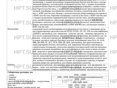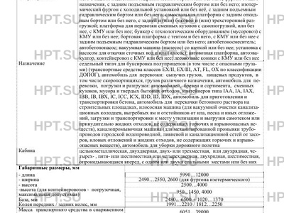 | Исполнение загрузочного пространства | седельно - сцепное устройство для полуприцепов; платформа с тентом или без него с задним подъемным гидравлическим бортом или без него; фургон общего назначения, с задним подъемным гидравлическим бортом или без него; изотермический фургон с холодильной установкой или без неё, с задним подъемным гидравлическим бортом или без него; самосвальная платформа с задним откидным бортом или без него, с задней и (или) боковой и (или) трехсторонней разгрузкой; платформа для перевозки сменных кузовов c самопогрузкой, или без нее, с КМУ или без нее; бункер с технологическим оборудованием (мусоровоз) с КМУ или без нее; бортовая платформа с тентом и без него, с КМУ или без нее с задним подъемным гидравлическим бортом или без него; автобетоносмеситель; автобетононасос; вакуумная машина (пылесос) со щеткой или без нее; установка с насосом для откачки сточных вод и ила (илосос); автовозная платформа, автоэвакуатор, контейнеровоз с КМУ или без нее; лесовозные коники с КМУ или без нее |