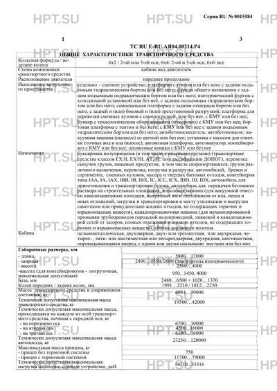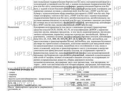 | Исполнение загрузочного пространства | седельно - сцепное устройство; платформа с тентом или без него с задним подъемным гидравлическим бортом или без него; фургон общего назначения с задним подъемным гидравлическим бортом или без него; изотермический фургон с холодильной установкой или без неё, с задним подъемным гидравлическим бортом или без него; самосвальная платформа с задним откидным бортом или без него, с задней и (или) боковой и (или) трехсторонней разгрузкой; платформа для перевозки сменных кузовов c самопогрузкой, или без нее, с КМУ или без нее; бункер с технологическим оборудованием (мусоровоз) с КМУ или без нее; бортовая платформа с тентом и без него, с КМУ или без нее с задним подъемным гидравлическим бортом или без него; автобетоносмеситель; автобетононасос; вакуумная машина (пылесос) со щеткой или без нее; установка с насосом для откачки сточных вод и ила (илосос); автовозная платформа, автоэвакуатор, контейнеровоз с КМУ или без нее; лесовозные коники с КМУ или без нее |