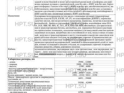 Назначение буксировка полуприцепов (в том числе с опасными грузами) (транспортные средства классов EX/II, EX/III, AT, FL по классификации ДОПОГ), перевозка: сыпучих грузов, грузов различного назначения; перевозка, погрузка и разгрузка: автомобилей, бревен и сортимента, сменных кузовов, контейнеров типа IAA, IA, IAX, IBB, IB, IBX, IC, IСC, ICX, IDD, ID, IDX; автомобиль для приготовления и транспортировки бетона, автомобиль для перекачки бетонного раствора на строительных площадках, илососная машина (для вакуумной очистки канализационных колодцев, выгребных ям и отстойников от ила, песка и иных отложений, загрузки и транспортировки к месту утилизации и выгрузки самотеком или принудительно жидких отходов, не содержащих горючих и взрывоопасных веществ), каналопромывочная машина (для механизированной промывки трубопроводов городской водопроводной, ливневой и канализационной сетей от засоров, иловых отложений и жидких отходов, не содержащих горючих и взрывоопасных веществ), уборка дорожного полотна
