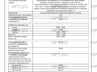 | Оборудование ТС | защитные металлические решетки окон кабины автомобиля и кузовафургона, медицинская аптечка (2 шт.); огнетушитель (2 шт.); знак аварийной остановки; система отопления; передние противотуманные фары; устройство ограничения максимальной скорости (функцию устройства ограничения максимальной скорости выполняет электронный блок управления двигателем); дневные ходовые огни; устройство вызова экстренных оперативных служб с функцией автоматического срабатывания при опрокидывании по заказу: предпусковой подогреватель двигателя; лебедка; коробка отбора мощности; сигнально-громкоговорящая установка (СГУ) кондиционер; передние противотуманные фары (кроме модификаций, на базе шасси, имеющих официальное утверждение на основании Правил ООН № 48-04). |