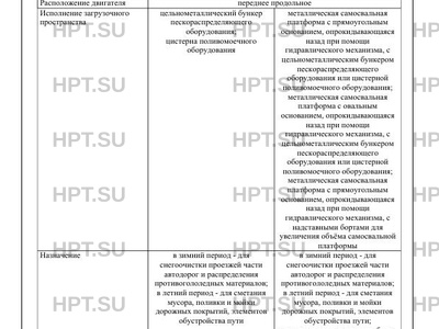 | Исполнение загрузочного пространства | цельнометаллический бункер пескораспределяющего оборудования; цистерна поливомоечного оборудования металлическая самосвальная платформа с прямоугольным основанием, опрокидывающаяся назад при помощи гидравлического механизма, c цельнометаллическим бункером пескораспределяющего оборудования или цистерной поливомоечного оборудования; металлическая самосвальная платформа с овальным основанием, опрокидывающаяся назад при помощи гидравлического механизма, c цельнометаллическим бункером пескораспределяющего оборудования или цистерной поливомоечного оборудования; металлическая самосвальная платформа с прямоугольным основанием, опрокидывающаяся назад при помощи гидравлического механизма, c надставными бортами для увеличения объёма самосвальной платформы |