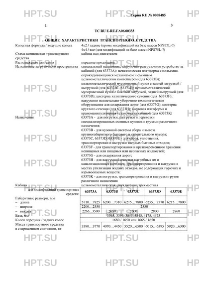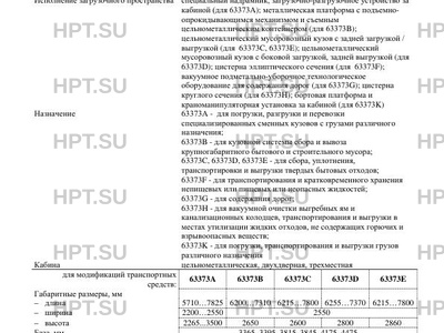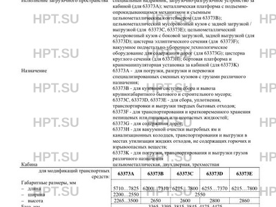| Исполнение загрузочного пространства | специальный надрамник, загрузочно-разгрузочное устройство за кабиной (для 63373А); металлическая платформа с подъемноопрокидывающимся механизмом и съемным цельнометаллическим контейнером (для 63373B); цельнометаллический мусоровозный кузов с задней загрузкой / выгрузкой (для 63373C, 63373E); цельнометаллический мусоровозный кузов с боковой загрузкой, задней выгрузкой (для 63373D); цистерна эллиптического сечения (для 63373F); вакуумное подметально-уборочное технологическое оборудование для содержания дорог (для 63373G); цистерна круглого сечения (для 63373H); бортовая платформа и краноманипуляторная установка за кабиной (для 63373K) |