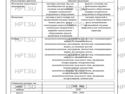 | Исполнение загрузочного пространства | цистерна для воды, бак для пенообразователя, кузов с отсеками для размещения пожарно-технического вооружения и оборудования фургон с отсеками для размещения аварийноспасательного оборудования, пожарно-технического вооружения и оборудования |