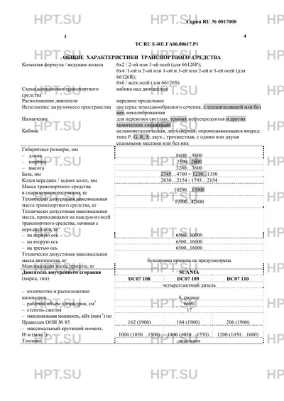 | Дополнительная информация | Транспортные средства предназначены для перевозки опасных грузов (тип FL по классификации ДОПОГ). Модификации применяемых шасси: для 66126P — P6X200 (P220…, P250…, P280…, P320…, P340…, P360…, P380…, P410…, P440…, P450…, P500…); G6X200 (G220…, G250…, G280…, G320…, G340…, G360…, G380…, G410…, G440…, G450…, G500…, G520…, G580…, G620…, G730…); R6X200 (R220…, R250…, R280…, R320…, R340…, R360…, R380…, R410…, R440…, R450…, R500…, R520…, R580…, R620…, R730…); S6X200 (S220…, S250…, S280…, S320…, S340…, S360…, S380…, S410…, S440…, S450…, S500…, S520…, S580…, S620…, S730…); P6X200 ADR (EX/II, EX/III, FL, OX, AT); G6X200 ADR (EX/II, EX/III, FL, OX, AT); R6X200 ADR (EX/II, EX/III, FL, OX, AT); S6X200 ADR (EX/II, EX/III, FL, OX, AT); для 66126R — P6X400 (P220…, P250…, P280…, P320…, P340…, P360…, P380…, P410…, P440…, P450…, P500…); G6X400 (G220…, G250…, G280…, G320…, G340…, G360…, G380…, G410…, G440…, G450…, G500…, G520…, G580…, G620…, G730…); R6X400 (R220…, R250…, R280…, R320…, R340…, R360…, R380…, R410…, R440…, R450…, R500…, R520…, R580…, R620…, R730…); S6X400 (S220…, S250…, S280…, S320…, S340…, S360…, S380…, S410…, S440…, S450…, S500…, S520…, S580…, S620…, S730…); P6X400 ADR (EX/II, EX/III, FL, OX, AT); G6X400 ADR (EX/II, EX/III, FL, OX, AT); R6X400 ADR (EX/II, EX/III, FL, OX, AT); S6X400 ADR (EX/II, EX/III, FL, OX, AT); для 66126S — P6X600 (P220…, P250…, P280…, P320…, P340…, P360…, P380…, P410…, P440…, P450…, P500…); G6X600 (G220…, G250…, G280…, G320…, G340…, G360…, G380…, G410…, G440…, G450…, G500…, G520…, G580…, G620…, G730…); R6X600 (R220…, R250…, R280…, R320…, R340…, R360…, R380…, R410…, R440…, R450…, R500…, R520…, R580…, R620…, R730…); S6X600 (S220…, S250…, S280…, S320…, S340…, S360…, S380…, S410…, S440…, S450…, S500…, S520…, S580…, S620…, S730…); P6X600 ADR (EX/II, EX/III, FL, OX, AT); G6X600 ADR (EX/II, EX/III, FL, OX, AT); R6X600 ADR (EX/II, EX/III, FL, OX, AT); S6X600 ADR (EX/II, EX/III, FL, OX, AT). Транспортные средства с двигателями DC13 115, DC13 141, DC13 147, DC13 148, DC13 155, DC16 101, DC16 102, DC16 103, DC16 105, DC16 106, DC16 107 соответствуют европейским экологическим нормам Евро-6. В связи с несоответствием параметров транспортных средств значениям, установленным в пунктах 2.1 и 2.2 приложения № 5 к техническому регламенту Таможенного союза «О безопасности колесных транспортных средств», для передвижения транспортных средств по территории государств — членов Таможенного союза необходимо оформление специального разрешения, в случае фактического превышения установленных значений. |