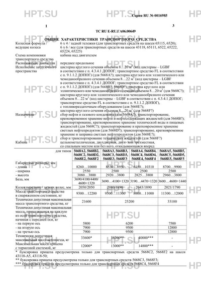 | Дополнительная информация | Для изготовления транспортных средств типов 5668A2, 5668B2, 5668D2, 5668E2 применяются модификации шасси 43118-А5, 43118-50; для 5668C2, 5668F2 — 43118-А5, 43118-50, 43118-37, 43118-RR, 43118-RS; для 5668A3, 5668B3, 5668C3, 5668D3, 5668E3, 5668F3 — 65111-А5, 65111-50; для 5668A4, 5668B4, 5668D4, 5668E4 — 65115-А5, 65115-50; для 5668C4, 5668F4 — 65115-А5, 65115-50, 65115-37, 65115-RR, 65115-RS; для 5668A5, 5668B5, 5668C5, 5668D5, 5668E5, 5668F5 — 6520-53, 6520-54, 6520-А5, 6520-В5; для 5668A6, 5668B6, 5668C6, 5668D6, 5668E6, 5668F6 — 6522-53, 6522-54, 6522-RT; для 5668A7, 5668B7, 5668C7, 5668D7, 5668E7, 5668F7 — 65222-53, 65222-54; для 5668A8, 5668B8, 5668C8, 5668D8, 5668E8, 5668F8 — 65224-53, 65224-54; для 5668A9, 5668B9, 5668C9, 5668D9, 5668E9, 5668F9 — 65225-53, 65225-54, 65225-RT. Наименование транспортного средства, определяемое его назначением: для 5668A2, 5668A3, 5668A4, 5668A5, 5668A6, 5668A7, 5668A8, 5668A9 — агрегат для сбора нефти; для 5668B2, 5668B3, 5668B4, 5668B5, 5668B6, 5668B7, 5668B8, 5668B9, 5668C2, 5668C3, 5668C4, 5668C5, 5668C6, 5668C7, 5668C8, 5668C9, 5668D2, 5668D3, 5668D4, 5668D5, 5668D6, 5668D7, 5668D8, 5668D9 — автоцистерна; 5668E2, 5668E3, 5668E4, 5668E5, 5668E6, 5668E7, 5668E8, 5668E9 — автотопливозаправщик; 5668F2, 5668F3, 5668F4, 5668F5, 5668F6, 5668F7, 5668F8, 5668F9 — машина вакуумная. Показатели масс не могут превышать максимальных для конкретного шасси, указанных в одобрении типа шасси и в его сопроводительной документации. В связи с несоответствием параметров транспортного средства 5668A3, 5668B3, 5668C3, 5668D3, 5668E3, 5668F3, 5668A4, 5668B4, 5668C4, 5668D4, 5668E4, 5668F4, 5668A5, 5668B5, 5668C5, 5668D5, 5668E5, 5668F5, 5668A6, 5668B6, 5668C6, 5668D6, 5668E6, 5668F6, 5668A7, 5668B7, 5668C7, 5668D7, 5668E7, 5668F7, 5668A8, 5668B8, 5668C8, 5668D8, 5668E8, 5668F8, 5668A9, 5668B9, 5668C9, 5668D9, 5668E9, 5668F9 значениям, установленным в пунктах 2.1, 2.2 приложения № 5 к техническому регламенту Таможенного союза «О безопасности колесных транспортных средств», для передвижения транспортных средств по территории государств — членов Таможенного союза необходимо оформление специального разрешения, в случае фактического превышения установленных значений. |