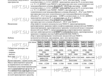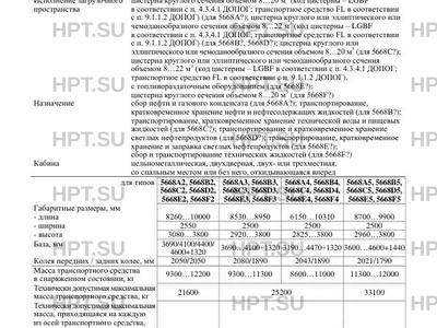 | Тип ТС | Для изготовления транспортных средств типов 5668A2, 5668B2, 5668D2, 5668E2 применяются модификации шасси 43118-А5, 43118-50; для 5668C2, 5668F2 - 43118-А5, 43118-50, 43118-37, 43118-RR, 43118-RS; для 5668A3, 5668B3, 5668C3, 5668D3, 5668E3, 5668F3 - 65111-А5, 65111-50; для 5668A4, 5668B4, 5668D4, 5668E4 - 65115-А5, 65115-50; для 5668C4, 5668F4 - 65115-А5, 65115-50, 65115-37, 65115-RR, 65115-RS; для 5668A5, 5668B5, 5668C5, 5668D5, 5668E5, 5668F5 - 6520-53, 6520-54, 6520-А5, 6520-В5; для 5668A6, 5668B6, 5668C6, 5668D6, 5668E6, 5668F6 - 6522-53, 6522-54, 6522-RT; для 5668A7, 5668B7, 5668C7, 5668D7, 5668E7, 5668F7 - 65222-53, 65222-54; для 5668A8, 5668B8, 5668C8, 5668D8, 5668E8, 5668F8 - 65224-53, 65224-54; для 5668A9, 5668B9, 5668C9, 5668D9, 5668E9, 5668F9 - 65225-53, 65225-54, 65225-RT. Наименование транспортного средства, определяемое его назначением: для 5668A2, 5668A3, 5668A4, 5668A5, 5668A6, 5668A7, 5668A8, 5668A9 - агрегат для сбора нефти; для 5668B2, 5668B3, 5668B4, 5668B5, 5668B6, 5668B7, 5668B8, 5668B9, 5668C2, 5668C3, 5668C4, 5668C5, 5668C6, 5668C7, 5668C8, 5668C9, 5668D2, 5668D3, 5668D4, 5668D5, 5668D6, 5668D7, 5668D8, 5668D9 - автоцистерна; 5668E2, 5668E3, 5668E4, 5668E5, 5668E6, 5668E7, 5668E8, 5668E9 - автотопливозаправщик; 5668F2, 5668F3, 5668F4, 5668F5, 5668F6, 5668F7, 5668F8, 5668F9 - машина вакуумная. Показатели масс не могут превышать максимальных для конкретного шасси, указанных в одобрении типа шасси и в его сопроводительной документации. В связи с несоответствием параметров транспортного средства 5668A3, 5668B3, 5668C3, 5668D3, 5668E3, 5668F3, 5668A4, 5668B4, 5668C4, 5668D4, 5668E4, 5668F4, 5668A5, 5668B5, 5668C5, 5668D5, 5668E5, 5668F5, 5668A6, 5668B6, 5668C6, 5668D6, 5668E6, 5668F6, 5668A7, 5668B7, 5668C7, 5668D7, 5668E7, 5668F7, 5668A8, 5668B8, 5668C8, 5668D8, 5668E8, 5668F8, 5668A9, 5668B9, 5668C9, 5668D9, 5668E9, 5668F9 значениям, установленным в пунктах 2.1, 2.2 приложения № 5 к техническому регламенту Таможенного союза «О безопасности колесных транспортных средств», для передвижения транспортных средств по территории государств - членов Таможенного союза необходимо оформление специального разрешения, в случае фактического превышения установленных значений. |