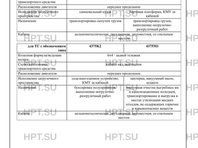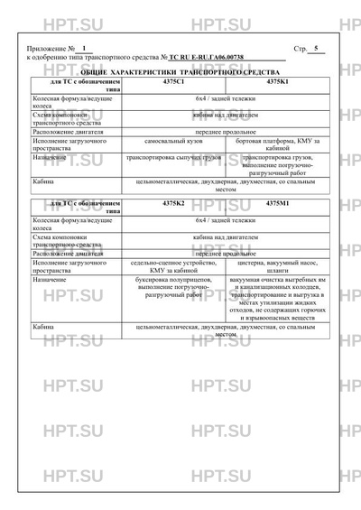 | Дополнительная информация | В связи с несоответствием параметров транспортного средства значениям, установленным в пункте 2.2 приложения № 5 к техническому регламенту Таможенного союза «О безопасности колесных транспортных средств», для передвижения транспортных средств по территории государств — членов Таможенного союза необходимо оформление специального разрешения, в случае фактического превышения установленных значений. Наименование транспортного средства, определяемое его назначением: для 4375С1 — автомобиль самосвал; для 4375К1 — автомобиль бортовой с КМУ; для 4375К2 — автомобиль тягач седельный с КМУ; для 4375М1 — машина вакуумная; для 4375М2 — машина илососная; для 4375М3 — мусоровоз с задней загрузкой; для 4375М4 — мусоровоз с задней загрузкой c КМУ; для 4375М5 — контейнерный мусоровоз; для 4375М6 — мусоровоз с боковой загрузкой; для 4375М7 — мусоровоз с боковой загрузкой с КМУ; для 4375М8 — подметально-уборочная вакуумная машина; для 4375W1 — автомобиль тягач седельный для буксировки полуприцепов с опасными грузами. Показатели масс не могут превышать максимальных для конкретного базового транспортного средства или шасси, указанных в одобрении типа на базовое транспортное средство или шасси, на табличке изготовителя базового транспортного средства или шасси и в его сопроводительной документации. Использована аббревиатура: КМУ — краноманипуляторная установка. Транспортные средства типа 4375W1 относятся к транспортным средствам EX/II, EX/III, FL, AT в соответствии с пунктом 9.1.1.2 Европейского соглашения о международной дорожной перевозке опасных грузов (ДОПОГ). Коммерческое наименование: для 4375M1 — МК-1, для 4375M2 — МК-2, для 4375M3 — МК-3, для 4375M4 — МК-4, для 4375M5 — МК-5, для 4375M6 — МК-6, для 4375M7 — МК-7, для 4375M8 — МК-8. Транспортные средства типов 4375К2, 4375W1 изготавливаются только на базовых транспортных средствах. |
