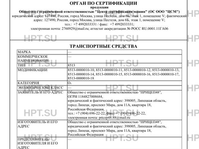 | Дополнительная информация | Транспортные средства не предназначены для перевозки опасных грузов. Наименование транспортного средства, определяемое его назначением: для 8513-0000010-10, 8513-0000010-11, 8513-0000010-12, 8513-0000010-13, 8513-0000010-14 — прицеп для легкового автомобиля грузовой; для 8513-0000010-15, 8513-0000010-16, 8513-0000010-17, 8513-0000010-18 — специализированный, прицеп для легкового автомобиля лодочный. |