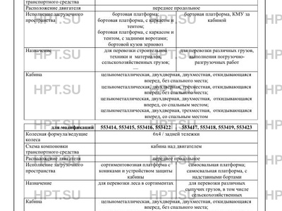 | Исполнение загрузочного пространства | бортовая платформа; бортовая платформа, с каркасом и тентом; бортовая платформа, с каркасом и тентом, с задними воротами; бортовой кузов зерновоз бортовая платформа, КМУ за кабиной сортиментовозная платформа с кониками и устройством защиты кабины самосвальная платформа; самосвальная платформа, с надставными бортами |