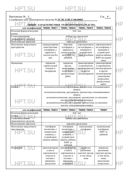 | Дополнительная информация | В связи с несоответствием параметров транспортных средств 780817, 780818, 780819, 780820, 780823, 780824, 780825, 780826, 780827, 780829, 780830, 780833, 780834, 780838, 780839 значениям, установленным в пунктах 2.1, 2.2 приложения № 5 к техническому регламенту Таможенного союза «О безопасности колесных транспортных средств», для передвижения транспортных средств по территории государств — членов Таможенного союза необходимо оформление специального разрешения, в случае фактического превышения установленных значений. Транспортные средства не предназначены для перевозки опасных грузов. Наименование транспортного средства, определяемое его назначением: для 780800, 780817, 780826, 780838 — автомобиль бортовой специализированный; для 780801, 780818, 780827, 780839 — автомобиль бортовой с КМУ; для 780802, 780819, 780829 — автомобиль-сортиментовоз; для 780803, 780820, 780830 — автомобиль-сортиментовоз с КМУ; для 780806, 780823 — автомобиль-тягач лесовозный; для 780807, 780824 — автомобиль-тягач лесовозный с КМУ; для 780808, 780825, 780833 — автомобиль-самосвал; для 780809, 780834 — автомобиль-самосвал с КМУ. Показатели масс не могут превышать максимальных для конкретного шасси, указанных в одобрении типа шасси и в его сопроводительной документации. Использована аббревиатура: КМУ — краноманипуляторная установка. Шасси (тип) / Шасси (модификация) / Модификации — 43118 / 43118-50, 43118-A5, 43118-RR, 43118-RS / 780800, 780801, 780802, 780803, 780806, 780807, 780808, 780809; 65111 / 65111-50, 65111-A5 / 780817, 780818, 780819, 780820, 780823, 780824, 780825; 65115 / 65115-50, 65115-A5, 65115-RR, 65115-RS / 780826, 780827, 780829, 780830, 780833, 780834; 65117 / 65117-50, 65117-A5, 65117-RR, 65117-RS / 780838, 780839 |