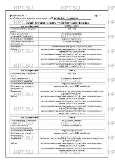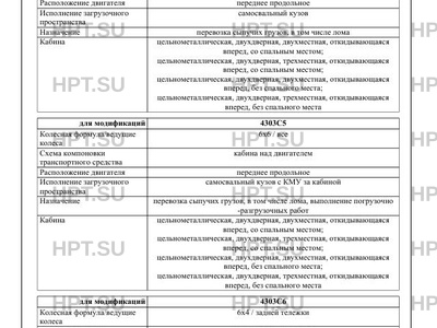 | Дополнительная информация | В связи с несоответствием параметров транспортных средств 4303C6, 4303C7, 4303C8 значениям, установленным в пунктах 2.1, 2.2 приложения № 5 к техническому регламенту Таможенного союза «О безопасности колесных транспортных средств», для передвижения транспортных средств по территории государств — членов Таможенного союза необходимо оформление специального разрешения, в случае фактического превышения установленных значений. Показатели масс не могут превышать максимальных для конкретного шасси, указанных в одобрении типа шасси и в его сопроводительной документации. Использованы аббревиатуры: КМУ — краноманипуляторная установка, ГМ — гидроманипулятор. Для изготовления транспортных средств 4303C3, 4303C4, 4303C5 применяется модификация шасси 43118-50; для 4303C6 — 65115-50, 65115-A5, 65115-5H; для 4303C7, 4303C8 — 6520-53, 6520-54. |