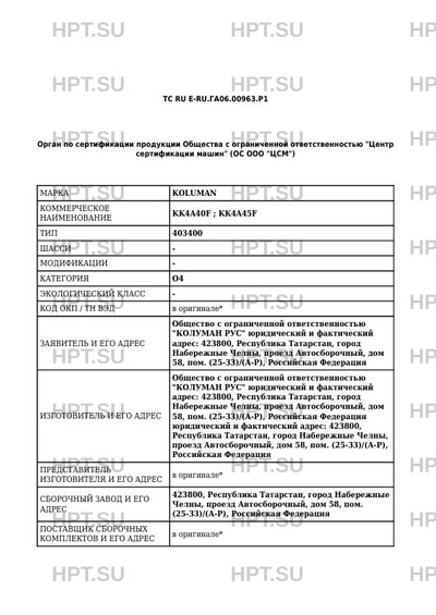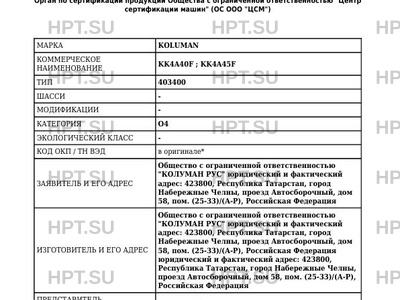 | Предприятие-изготовитель | Общество с ограниченной ответственностью "КОЛУМАН РУС". юридический и фактический адрес: 423800, Республика Татарстан, город Набережные Челны, проезд Автосборочный, дом 58, пом. (25-33)/(А-Р), Российская Федерация. |