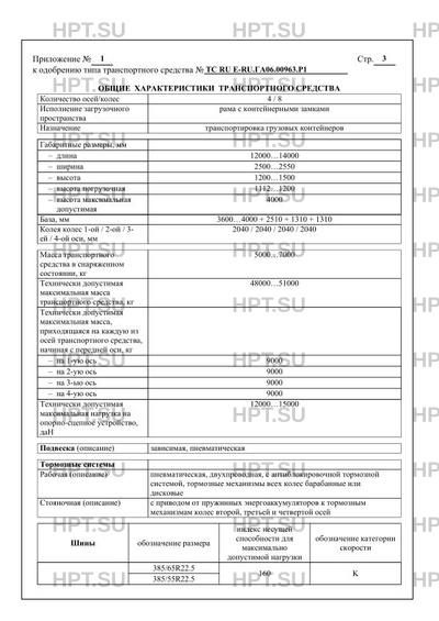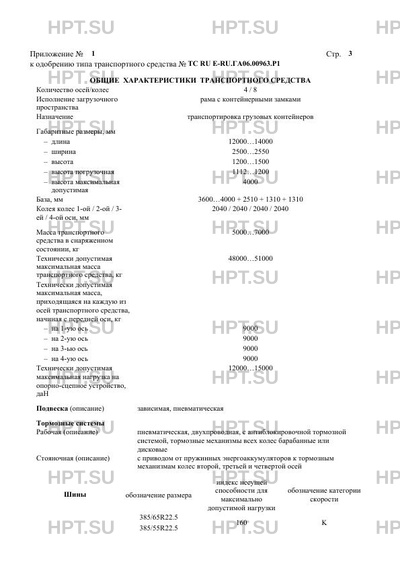 | Тип ТС | В связи с несоответствием параметров транспортного средства значениям, установленным в пункте 2.2 приложения № 5 к техническому регламенту Таможенного союза «О безопасности колесных транспортных средств», для передвижения транспортных средств по территории государств - членов Таможенного союза необходимо оформление специального разрешения, в случае фактического превышения установленных значений. Наименование транспортного средства, определяемое его назначением: полуприцеп-контейнеровоз. |