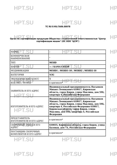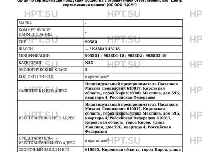 | Дополнительная информация | Транспортные средства изготавливаются на базе шасси модификаций: 43118-50, 43118-A5, 43118-RR, 43118-RS. Транспортные средства не предназначены для перевозки опасных грузов. Наименование транспортного средства, определяемое его назначением: для 9058D1 — автомобиль-тягач лесовозный; для 9058D1-10 — автомобиль-тягач лесовозный с ГМ; для 9058D2 — автомобиль-сортиментовоз; для 9058D2-10 — автомобиль-сортиментовоз с ГМ. Показатели масс не могут превышать максимальных для конкретного шасси, указанных в одобрении типа шасси и в его сопроводительной документации. Использована аббревиатура: ГМ — гидроманипулятор. |