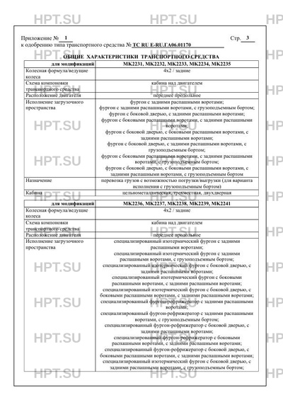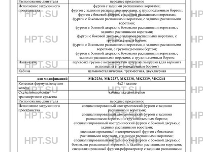 | Оборудование ТС | электронная система контроля устойчивости; устройство вызова экстренных оперативных служб по заказу: подушка безопасности водителя, ремень безопасности с преднатяжителем, кондиционер, электростеклоподъемники, наружные зеркала заднего вида с обогревом и/или электроприводом, центральный замок, предпусковой подогреватель-отопитель, дополнительный отопитель, ограничитель скорости, тахограф, внутреннее зеркало; холодильное оборудование (для МК2236, МК2237, МК2238, МК2239, МК2241); краноманипуляторная установка (для MK2242, MK2243, MK2244, MK2245, MK2246); обтекатель; отопитель; грузоподъемный борт |