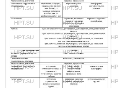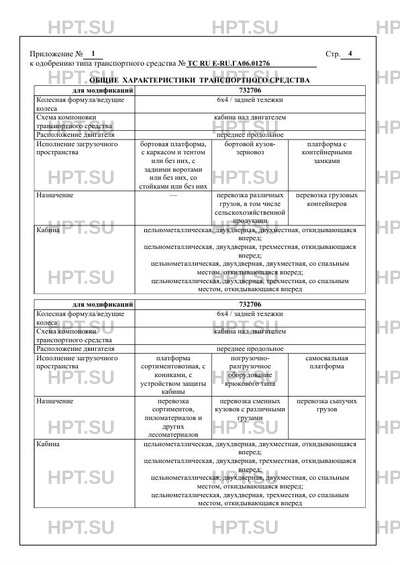 | Тип ТС | В связи с несоответствием параметров транспортных средств значениям, установленным в пунктах 2.1, 2.2 приложения № 5 к техническому регламенту Таможенного союза «О безопасности колесных транспортных средств», для передвижения транспортных средств по территории государств - членов Таможенного союза необходимо оформление специального разрешения, в случае фактического превышения установленных значений. Транспортные средства не предназначены для перевозки пищевых продуктов и опасных грузов. Показатели масс не могут превышать максимальных для конкретного базового транспортного средства или шасси, указанных в одобрении типа на базовое транспортное средство или шасси, на табличке изготовителя базового транспортного средства или шасси и в его сопроводительной документации. Использованы аббревиатуры: КМУ - краноманипуляторная установка, ГМ - гидроманипулятор. Наименование транспортного средства, определяемое его назначением: для 732706 - автомобиль специальный; для 732707 - кран-манипулятор автомобильный; для 732708 - кран-манипулятор автомобильный (седельный тягач); для 732709 - автогидроподъемник. Базовое транспортное средство (Модификация) Шасси (модификация) Модификации Категория 65115-50, 65115-A5, 732706 N3 65117-50, 65117-A5, — 65111-50 732706, 732707 65115-50, 65115-A5, 65111-50 732709 N3G 65116-A5 65115-50, 65115-A5, 65111-50 732708 N3 |