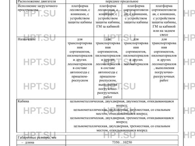 | Исполнение загрузочного пространства | платформа лесовозная, с кониками, с устройством защиты кабины платформа лесовозная, с кониками, с устройством защиты кабины, ГМ за кабиной платформа сортиментовозн ая, с кониками, с устройством защиты кабины платформа сортиментовозн ая, с кониками, с устройством защиты кабины, ГМ за кабиной или на заднем свесе |