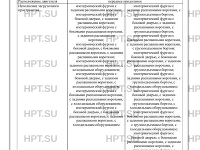 | Исполнение загрузочного пространства | изотермический фургон с задними распашными воротами; изотермический фургон с боковой дверью, с задними распашными воротами; изотермический фургон с боковыми распашными воротами, с задними распашными воротами; изотермический фургон с боковой дверью, с боковыми распашными воротами, с задними распашными воротами; изотермический фургон с задними распашными воротами, с холодильным оборудованием; изотермический фургон с боковой дверью, с задними распашными воротами, с холодильным оборудованием; изотермический фургон с боковыми распашными воротами, с задними распашными воротами, с холодильным оборудованием; изотермический фургон с боковой дверью, с боковыми распашными воротами, с задними распашными воротами, с холодильным оборудованием изотермический фургон с задними распашными воротами, с грузоподъемным бортом; изотермический фургон с боковой дверью, с задними распашными воротами, с грузоподъемным бортом; изотермический фургон с боковыми распашными воротами, с задними распашными воротами, с грузоподъемным бортом; изотермический фургон с боковой дверью, с боковыми распашными воротами, с задними распашными воротами, с грузоподъемным бортом; изотермический фургон с задними распашными воротами, с грузоподъемным бортом, с холодильным оборудованием; изотермический фургон с боковой дверью, с задними распашными воротами, с грузоподъемным бортом, с холодильным оборудованием; изотермический фургон с боковыми распашными воротами, с задними распашными воротами, с грузоподъемным бортом, с холодильным оборудованием; изотермический фургон с боковой дверью, с боковыми распашными воротами, с задними распашными воротами, с грузоподъемным бортом, с холодильным оборудованием фургон с задними распашными воротами; фургон с боковой дверью, с задними распашными воротами; фургон с боковыми распашными воротами, с задними распашными воротами; фургон с боковой дверью, с боковыми распашными воротами, с задними распашными воротами фургон с задними распашными воротами, с грузоподъемным бортом; фургон с боковой дверью, с задними распашными воротами, с грузоподъемным бортом; фургон с боковыми распашными воротами, с задними распашными воротами, с грузоподъемным бортом; фургон с боковой дверью, с боковыми распашными воротами, с задними распашными воротами, с грузоподъемным бортом фургон с боковой одностворчатой дверью; фургон с боковой одностворчатой дверью, с окнами; фургон с задней одностворчатой дверью; фургон с задней одностворчатой дверью, с окнами; фургон с боковой и задней одностворчатыми дверями; фургон с боковой и задней одностворчатыми дверями, с окнами; фургон с задними распашными бортовая платформа; бортовая платформа, с каркасом и тентом; бортовая платформа, с каркасом и тентом, с задними распашными воротами воротами; фургон с задними распашными воротами, с окнами; фургон с задними распашными воротами, с боковой одностворчатой дверью; фургон с задними распашными воротами, с боковой одностворчатой дверью, с окнами бортовая платформа с краноманипуляторной установкой; бортовая платформа, с каркасом и тентом, с задними распашными воротами, с грузоподъемным бортом |